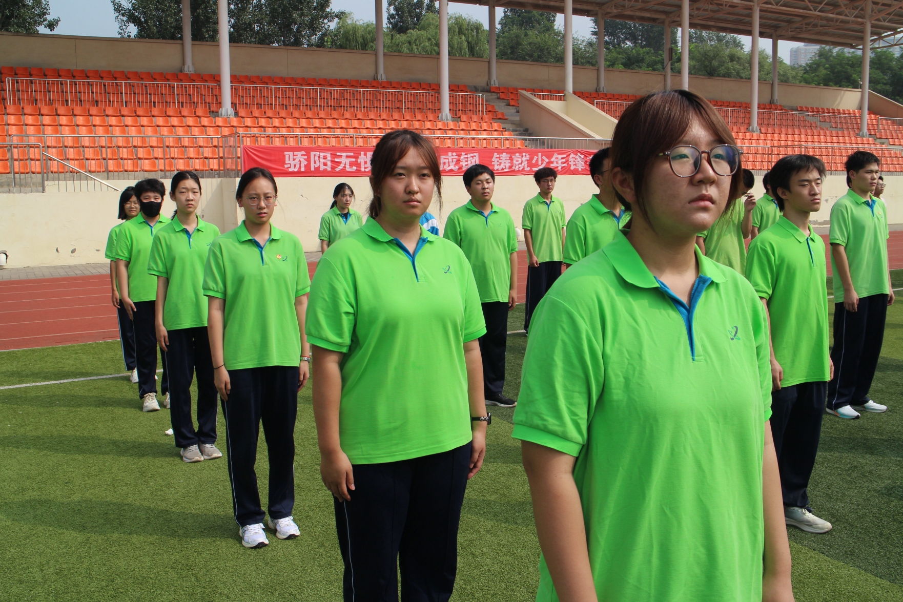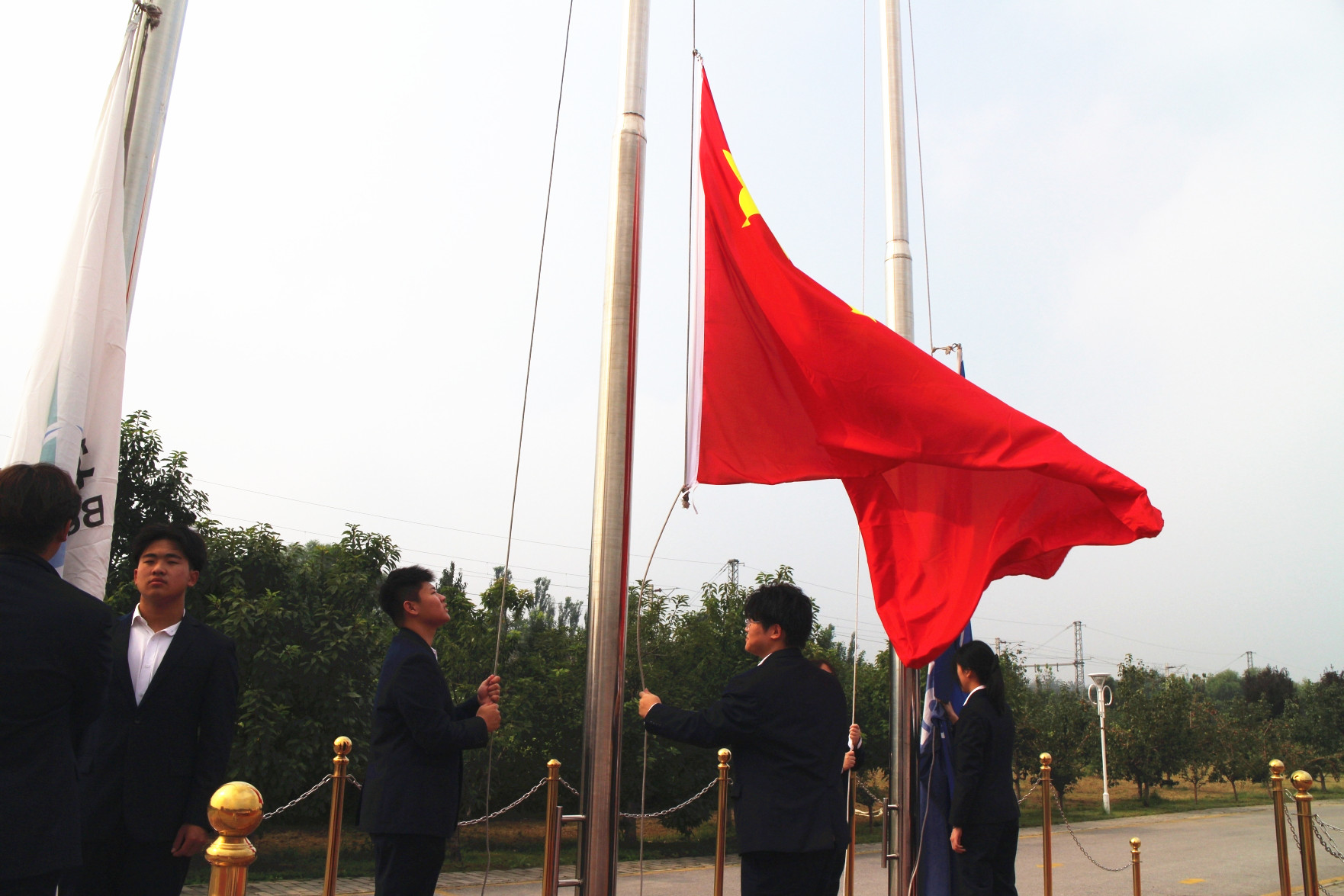 升旗仪式庄严肃穆,全体师生齐唱国歌、校歌,展现出对祖国和学校的热爱与敬意。